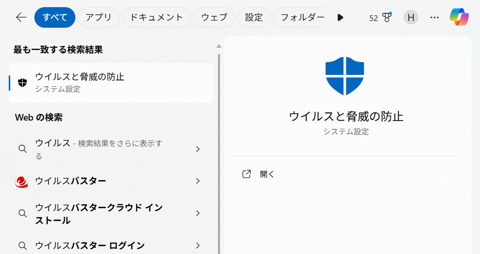 Windowsの検索バーに「ウイルス」と入力して「ウイルスと驚異の防止」を開きます。