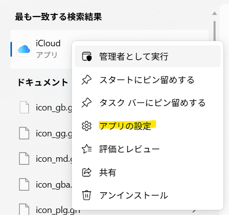 Windowsの検索ボックスから「iCloud」と検索し、右クリックで「アプリの設定」という項目があればMicrosoft Store版なのでアンインストール(画面下)しましょう。