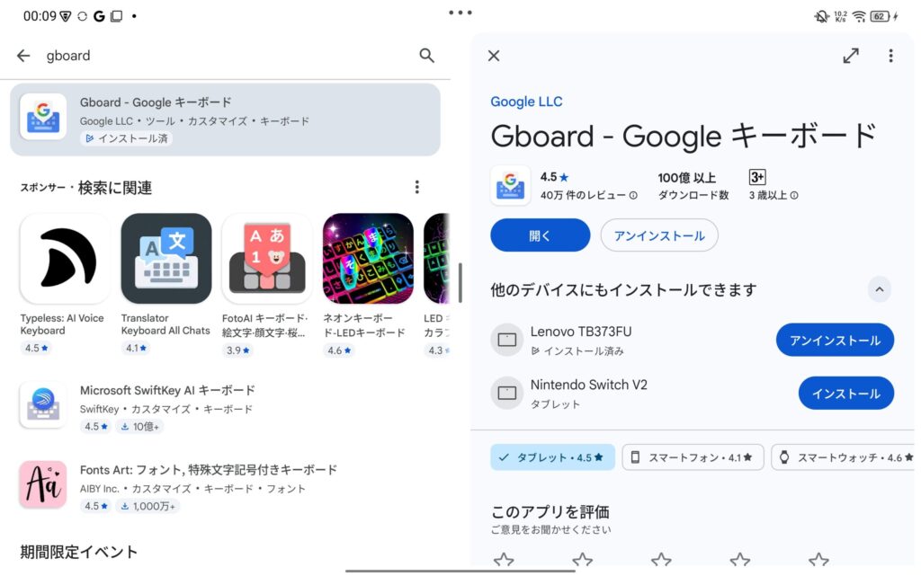 このままではまだ日本語が入力できないので、Playストアから日本語入力アプリ(GboardやShimejiなど)をインストールしましょう。