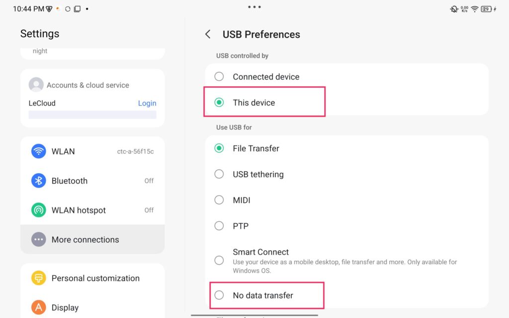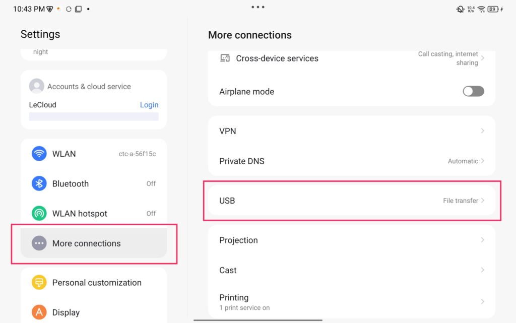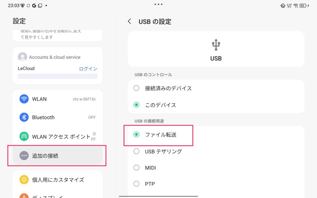 次に設定画面の「More connections」>「USB」と進みます。