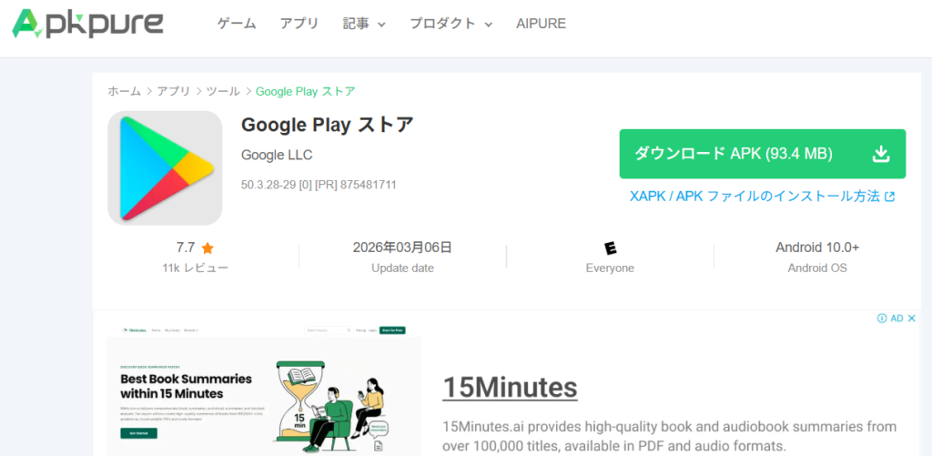 まずはApkpureでPlayストアのapkファイルをダウンロードします。(野良apkのDLは自己責任でね!)