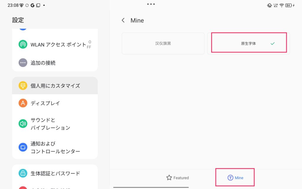 下のほうの「Mine」をタップし「原生字体」を選択することで見慣れたフォントに変わります。