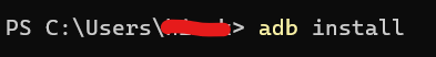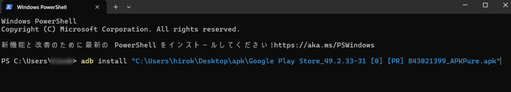 Windows PowerShellから「adb install (半角スペース)」を入力します。まだEnterは押さない!