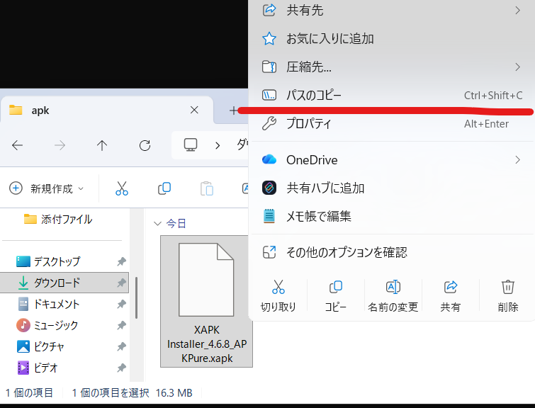 ここで先ほどDLしたapkを右クリックし、「パスのコピー」をクリックします。
