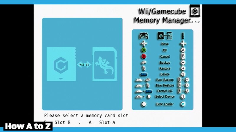 Wii本体に挿さっているGCメモリーカードのスロットを聞かれるので「A」または「B」ボタンを押します。(Wii本体にスロットの位置が表記されています)