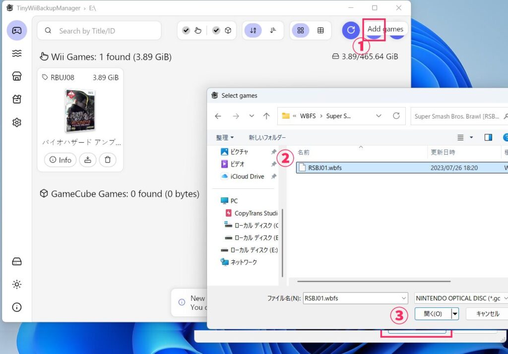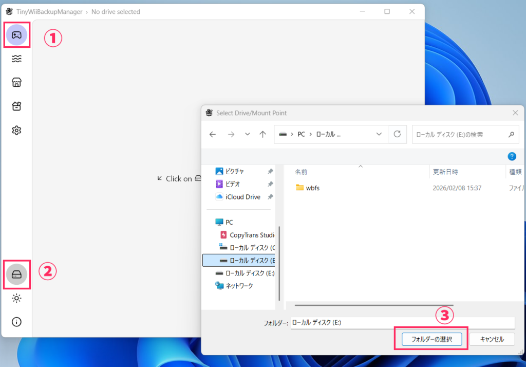 まずはBackupManagerを起動します。下の図①→②→③の順で接続している外部ストレージを開きましょう(wbfsフォルダがなければ作っておきましょう)