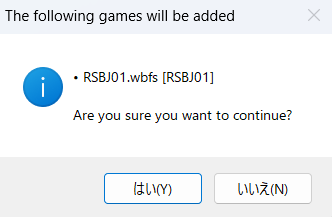 もし外付けHDDに「wbfs」フォルダを作っていない場合は以下のポップアップがでるので「はい」を押して作成します。