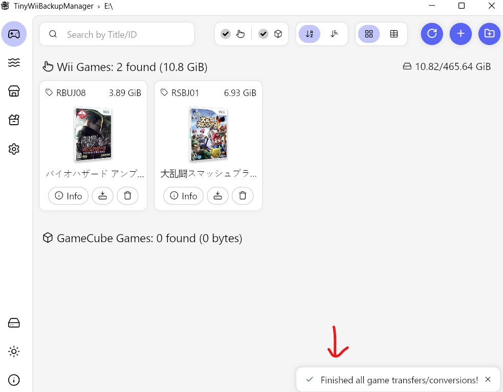 なお、Wii Backup Managerを使って転送するのはあくまで4GBを超えるWiiのゲームイメージを転送する場合です。圧縮(分割)されたwbfs形式のゲームイメージ(4GB未満)を転送する場合には、普通にコピペで転送できます。ただし、その場合は上記のようにフォルダの名前には注意しましょう。