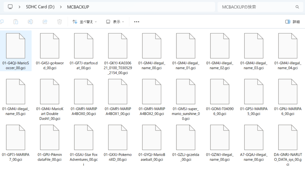 GCのセーブデータは「.gci」という形式で保存されていますが、最初に取得したGCの空セーブデータのように「.raw」という形式に変換する必要があります。